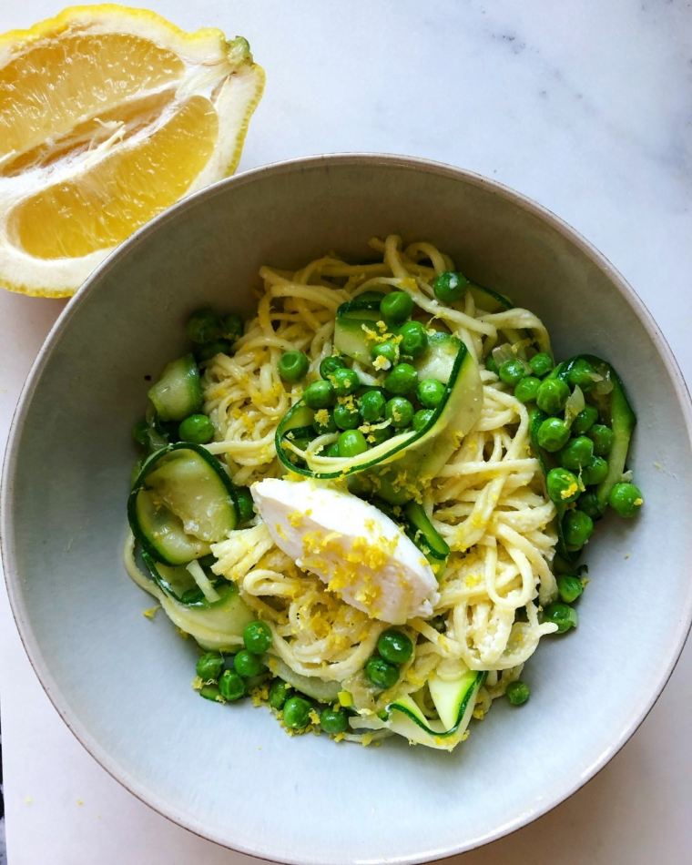 Cukinie trzeba pokroić w plastry (wzdłuż lub krążki) i smażyć na patelni na której smażyła się cebula. Gdy cukiniowe wstążki zmiękną, należy dodać do nich wcześniej usmażoną cebulę, wyciśnięte ząbki czosnku, otartą skórkę z cytryny. Całość trzeba krótko podsmażyć, a następnie zalać wszystko śmietanką. Kolejnym krokiem jest dodanie ugotowanego już groszku. Całość należy doprawić solą i świeżym pieprzem. Następnie całość trzeba krótko zagotować około 2 minuty. Następnie odstawić na bok.