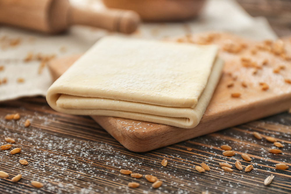 1. Arkusz ciasta francuskiego posmaruj roztrzepanym jajkiem. Następnie złóż go na trzy części, zaginając do środka ciasto od góry i z dołu. Włóż na 15 minut do zamrażalnika.