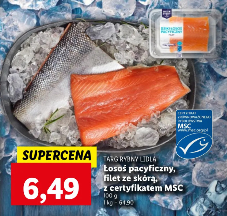 W Lidlu można obecnie kupić filet łososia pacyficznego ze skórą, z certyfikatem MSC w bardzo atrakcyjnej cenie. Za 100 gramów zapłacicie 6,49 zł.
