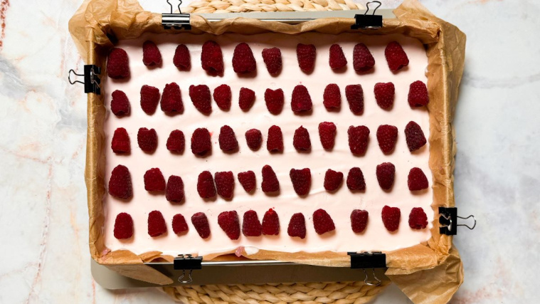 Owoce myjemy pod zimną, bieżącą wodą. W miarę możliwości delikatnie osuszamy ręcznikiem papierowym. Układamy na malinowej piance.