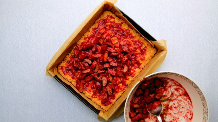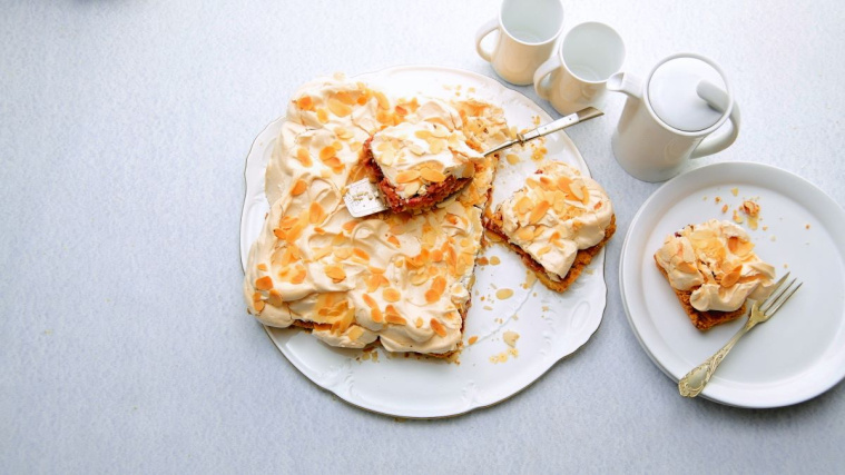 Smarujemy podpieczony spód na ciasto kruche z rabarbarem i bezą pozostałą konfiturą malinową. Świetnie sprawdzi się też tutaj dżem truskawkowy. Wykładamy przygotowane wcześniej warzywo z dodatkami. Na wierzchu umieszczamy bezę. Możemy ją rozsmarować szpatułką lub wycisnąć za pomocą szprycy, żeby zrobić ozdobne kształty. Posypujemy płatkami migdałowymi. Pieczemy ciasto przez 20 minut w 170°C. Następnie zmniejszamy temperaturę do 60°C i włączamy termoobieg. Czekamy, aż beza się wysuszy i stanie się chrupka. Potrwa to mniej więcej kwadrans.