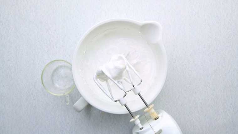 Ubijamy odłożone wcześniej białka na wysokich obrotach miksera. Kiedy zaczną sztywnieć, stopniowo dosypujemy drobny biały cukier do wypieków (200 g). Zauważymy, że piana staje się błyszcząca i gęsta. Miksujemy ją, aż będziemy mieli pewność, że rozpuściły się wszystkie kryształki cukru. Na koniec dodajemy łyżkę mąki ziemniaczanej (można też wykorzystać sproszkowany budyń śmietankowy lub waniliowy bez cukru).