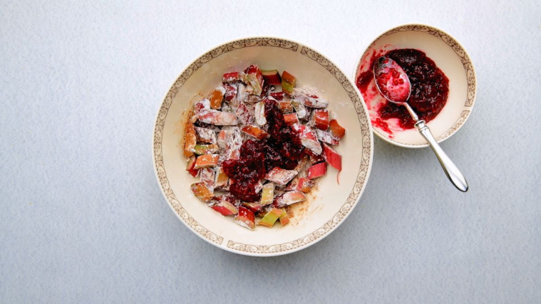 Myjemy i osuszamy rabarbar. Nie obierajmy go, żeby środek ciasta miał ładny różowy kolor. Odcinamy zdrewniałe końcówki. Kroimy łodygi na kawałki o długości około 1 cm. Wkładamy je do miski. Dodajemy 3 łyżki mąki ziemniaczanej i cynamon (można też wykorzystać inne przyprawy korzenne, a przede wszystkim ziarenka wydobyte nożykiem z suszonej laski wanilii). Mieszamy. Łączymy tak przygotowany rabarbar z połową dżemu z malin, najlepiej przyrządzonego samodzielnie, sięgniętego z domowej spiżarni.