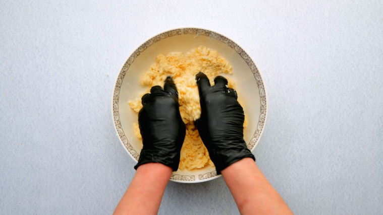Oddzielamy żółtka od białek. Przesiewamy do miski mąkę pszenną (najlepiej krupczatkę) i skrobię ziemniaczaną. Dodajemy sól, proszek do pieczenia i 50 g drobnego białego cukru. Schłodzone masło kroimy w małą kostkę i dorzucamy je do miski z suchymi składnikami. Rozdrabniamy je na kruszonkę. Możemy też przygotować bazę na kruche ciasto na stolnicy (drewnianej lub silikonowej). Masło warto wtedy posiekać z mąką nożem lub specjalnym, półokrągłym rozdrabniaczem. Dzięki temu nie składniki nie mają styczności z ciepłem naszych dłoni. Na koniec dodajemy żółtka. Szybkimi ruchami zagniatamy zwarte ciasto. Jeśli zdążyło się za bardzo zagrzać, owijamy je folią spożywczą i chłodzimy w lodówce.