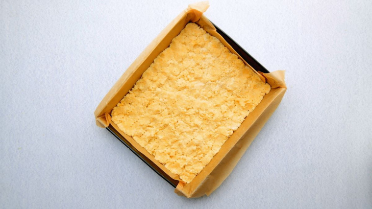 Wylepiamy ciastem foremkę o wymiarach 26 x 36 cm. Możemy je spłaszczyć dłońmi, a następnie rozwałkować między dwoma arkuszami pergaminu. Innym sposobem jest podzielenie go na małe kawałki i rozłożenie ich równomiernie na dnie blaszki, a następnie dociśnięcie palcami. Nakłuwamy spód na ciasto z rabarbarem i bezą widelcem. Rozgrzewamy piekarnik do 170°C (tryb góra-dół). W czasie, kiedy nabiera temperatury, chłodzimy kruchą bazę w lodówce. Następnie pieczemy przez około 20 minut, aż zmieni kolor na złoty.