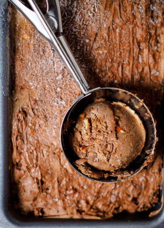 Wszystkie składniki oprócz orzechów zmiksować ze sobą, aż będą gładkie i kremowe. Następnie wlać do maszyny do lodów lub przelać do pojemnika, wymieszać z podprażonymi, posiekanymi orzechami i zamrozić. Przed podaniem wyjąć z zamrażarki na około 10 minut aby można było je łatwiej nabierać.