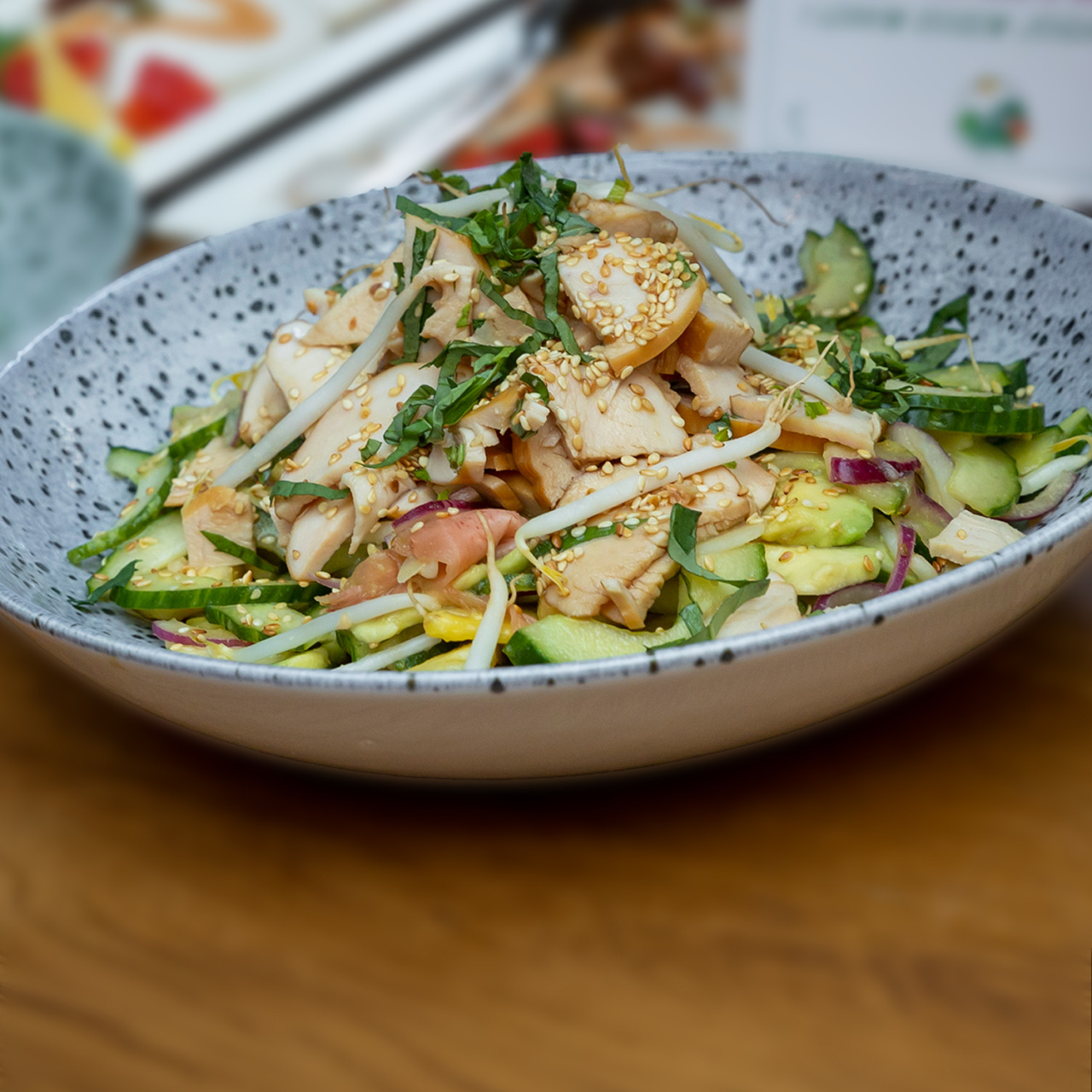 Wszystkie pokrojone składniki sałatki wkładamy do miski, zalewamy połową sosu i dokładnie mieszamy. Do drugiej miski wkładamy pokrojonego w kostkę kurczaka, zalewamy pozostałym sosem i odkładamy na kilkanaście minut. Sałatkę nakładamy do małych miseczek, do każdej dodajemy kurczaka i posypujemy bazylią i sezamem.