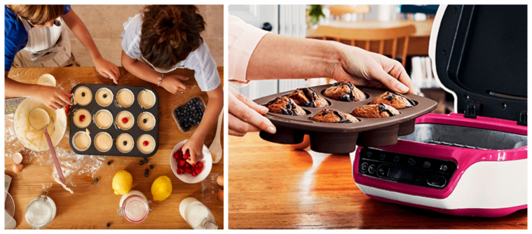 Wlewanie ciasta do papierowych foremek może być nieco trudniejsze, dlatego najlepiej wybrać sztywne kokilki lub foremki. Na tym etapie ponownie pomoże nam Tefal Cake Factory, gdzie w zestawie dołączone są dwie silikonowe formy, taca do pieczenia oraz ruszt. Do wyboru mamy dwa warianty foremek PROFLEX- na 6 babeczek lub 6 mini ciastek. Wystarczy przelać do nich masę i ustawić odpowiedni program na panelu sterowania. Reszta zrobi się sama, a my nie musimy martwić się o poparzenia ani stale pilnować czasu i doglądać wypieków.