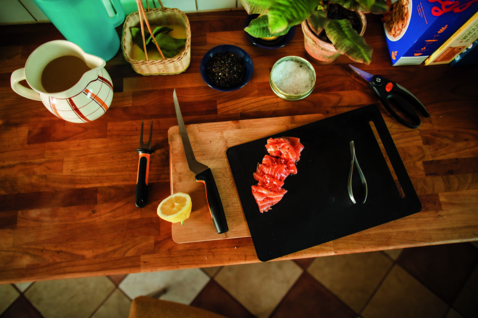 - Deski do krojenia, np. bambusowy zestaw desek do krojenia Fiskars Functional Form. Zestaw składa się z 3 części: profilowanej bambusowej deski z rowkami na okruchy chleba i antypoślizgowymi silikonowymi nóżkami, płaskiej bambusowej deski do krojenia warzyw, owoców, ziół, mięs i serów oraz z łatwej do umycia deski z tworzywa.
