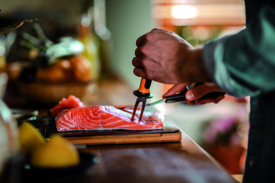 - Widelec do ryb, np. widelec Fiskars Functional Form z ostrzami z japońskiej stali nierdzewnej, ergonomiczną rękojeścią i ogranicznikiem gwarantującym bezpieczne użytkowanie i pewny chwyt.