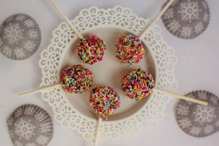 Wszystkie składniki ciasta mieszamy z sobą i wkładamy do foremek na cake pops. Pieczemy ok. 20-25 minut (w zależności od piekarnika) w temp. 180 stopni. Przygotowujemy polewę: wszystkie składniki podgrzewamy w garnku i mieszamy do momentu, aż serek się rozpuści. Kulki z ciasta nadziewamy po kolei na patyczki, zanurzamy na moment w polewie i od razu dekorujemy ulubioną posypką. Gdyby polewa była zbyt gęsta, dodajemy więcej mleka. Patyczki wbijamy w styropian lub np. przekrojonego ziemniaka, aby polewa zastygła.