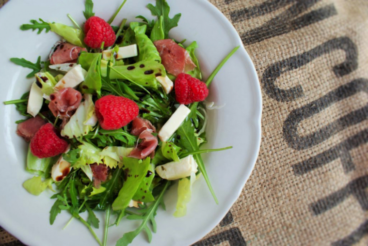 Serek topiony kroimy w cienkie paseczki i wykładamy razem z malinami na wierzch sałatki. Całość polewamy oliwą z oliwek oraz sosem balsamicznym. Smacznego!