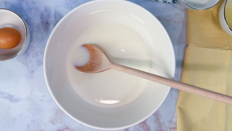 Mleko wlewamy do miski, dosypujemy kaszę mannę, mieszamy ręcznie (drewnianą łyżką) lub mikserem, odstawiamy na 30 minut. Ten etap jest konieczny, inaczej naleśniki nie wyjdą.