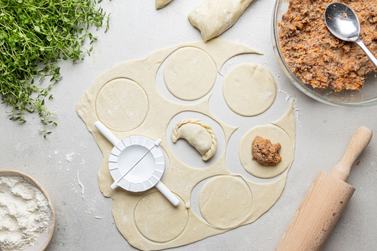 Dzielimy ciasto na 2 lub 3 części. Pierwszą z nich umieszczamy na stolnicy, resztę z powrotem wkładamy pod ściereczkę. Rozwałkowujemy ciasto na cienki placek. Wykrajamy z niego kółka (za pomocą odwrotu maszynki do klejenia pierogów, wykrawaczki do ciastek lub szklanki). Nakładamy porcję farszu na środek. Składamy kółko na pół. Sklejamy brzegi w falbankę lub warkocz. Można też wykorzystać ręczną maszynkę lub przycisnąć ranty ząbkami widelca.