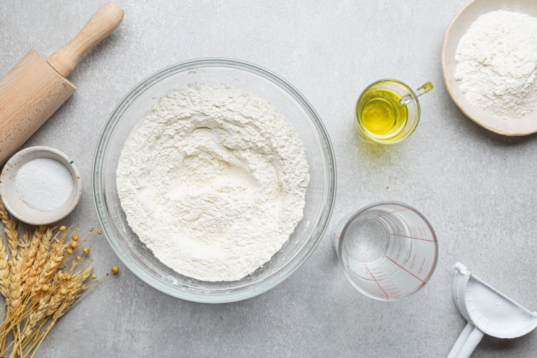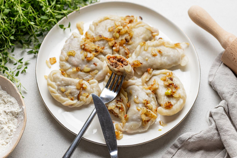 Wsypujemy mąkę ze szczyptą soli do miski. Wlewamy bardzo gorącą wodę, żeby zaparzyć ciasto. Dzięki temu pierożki z mięsem wyjdą miękkie i delikatne. Dodajemy olej (może być też roztopione masło). Mieszamy drewnianą łyżką lub szpatułką. Kiedy składniki przestygną na tyle, żeby nie parzyły dłoni, przekładamy je na stolnicę i wyrabiamy na gładkie ciasto przez około 10 minut. Raczej nie będzie potrzebne podsypywanie go mąką, bo z tego przepisu wychodzi idealnie elastyczne i nie przykleja się do podłoża.