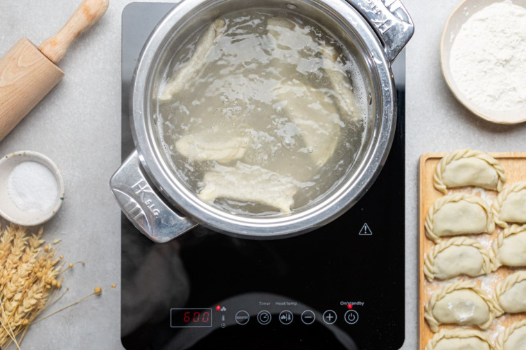 Zagotowujemy wodę ze szczyptą soli w dużym garnku. Wrzucamy do niego partię pierogów (ostrożnie, żeby nie pochlapać się wrzątkiem). Zmniejszamy moc palnika. Jeśli woda będzie mocno bulgotać, może porwać delikatne ciasto i dostać się do środka kieszonek. Wyławiamy pierogi z mięsem mielonym z rosołu łyżką cedzakową po 4 minutach od momentu, kiedy wypłyną na powierzchnię.