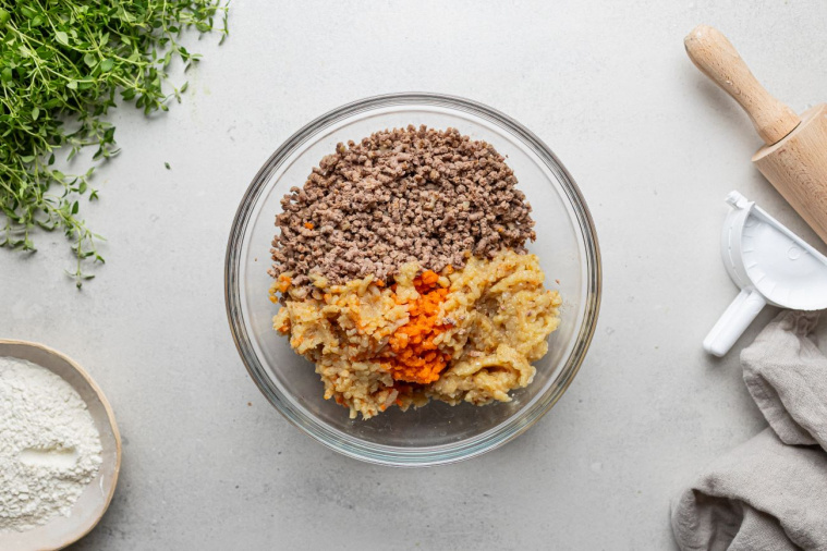 Obieramy wołowinę z rosołu z kości i chrząstek. Dzielimy na mniejsze kawałki. Nie usuwajmy tłuszczu, przyda się, żeby farsz na pierogi z mięsem nie był zbyt suchy. Poza tym tłuszcz jest nośnikiem smaku, więc nie może go tutaj zabraknąć. Przepuszczamy przez maszynę z sitkiem o średnich oczkach wołowinę wraz z jarzynami (jeśli nie zachowaliśmy ich z rosołu, po prostu podgotujmy marchewkę i pietruszkę w rondelku lub przyrządźmy je na parze). Mielimy także podsmażoną cebulę. Doprawiamy farsz do pierogów solą i pieprzem. Można też wykorzystać takie przyprawy i zioła jak gałka muszkatołowa, natka pietruszki, koperek lub majeranek.