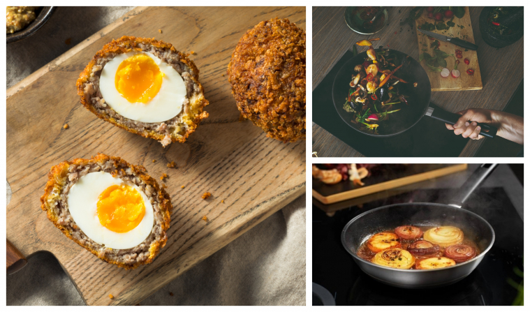 - Świetnym patentem na efektowne danie są też jajka faszerowane w skorupkach. W tym przypadku nie obieramy jajka i przekrajamy je na pół, a następnie wydrążamy całe białko i żółtko. Rozdrabiamy je, dodając podsmażoną cebulkę i pieczarki i tak przygotowaną masą, ponownie napełniamy puste skorupki. Teraz wystarczy zapanierować farsz w bułce tartej i usmażyć na patelni na chrupko. Gotowane jajka można też oblepić doprawionym mięsem mielonym, a następnie usmażyć na głębokim tłuszczu. Przygotowując takie panierowane jajka, warto wybrać głęboką patelnię, na której łatwo będzie nam je smażyć i przewracać. Najlepsza będzie taka z grubym dnem, które pozwoli równomiernie rozgrzać olej i długo utrzymywać odpowiednią jego temperaturę.