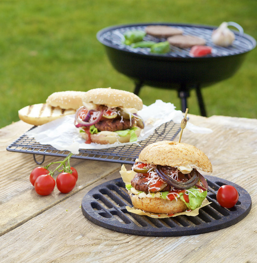 - Burgery usmażyć z obu stron na pozostałym oleju (na ruszcie lub grillowej płycie do smażenia).