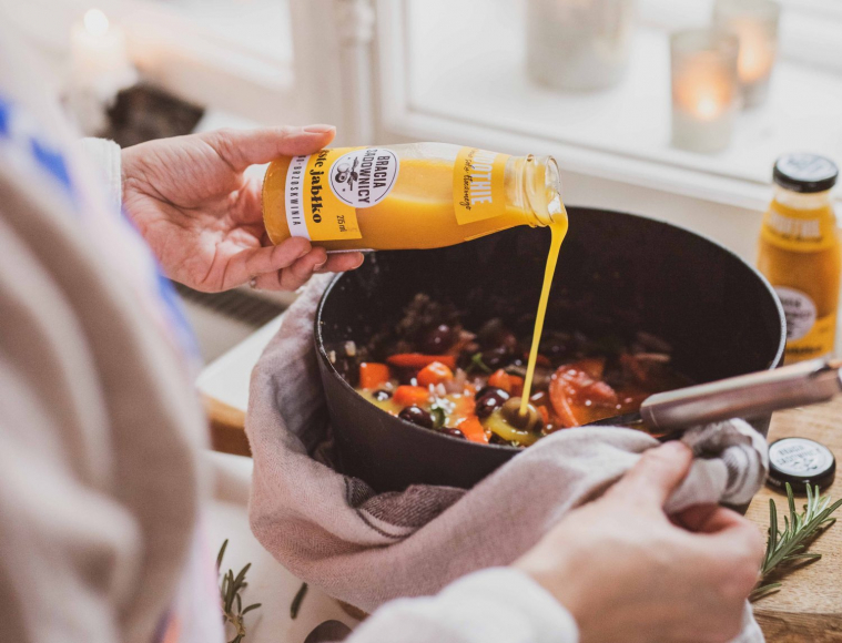Jak połączyć drób z owocami? Pomarańcze do kaczki czy kurczak faszerowany jabłkami, to dobrze znane nam zestawienia. To klasyki, które goszczą w polskich domach na odświętnym stole. Jednak warto iść o krok dalej i bazując na jakościowych produktach z jabłek, zrobić kurczaka w aromatycznym sosie, który przypomni zapach prosto z sadu! Gęste jabłko od Braci Sadowników wzięła na tapet Eliza Mórawska, autorka WhitePlate.com, przygotowując wyjątkowy obiad w jednym garnku. To pyszne danie wymagające odrobinę więcej czasu i zaangażowania, które później odwdzięcza się wyśmienitym smakiem. Idealna propozycja na rodzinne święta lub inne okazje, jak urodziny czy przyjęcie komunijne w domu. Z podanych proporcji przygotujecie aż 8 porcji. Danie najłatwiej przygotować w większym (o pojemności ok. 4,5-6 litrów), żeliwnym lub żaroodpornym garnku, aby w trakcie gotowania móc co jakiś czas delikatnie przekładać mięso, by równomiernie się gotowało.