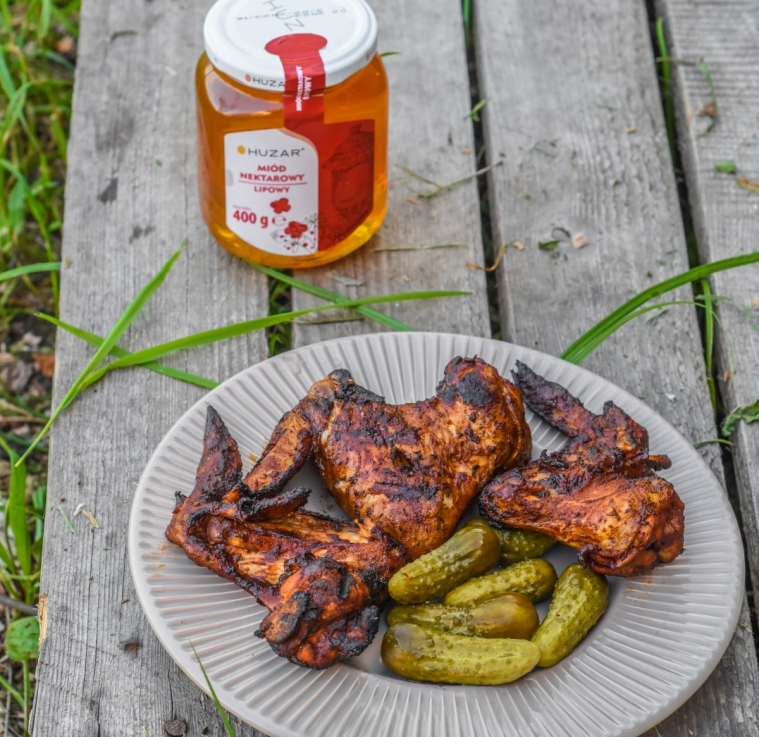 Szukając przepisu na tradycyjne danie z grilla często napotykamy na przepisy z drobiem Mogą być to wcześniej marynowane np.: udka, podudzia lub skrzydełka. Sekret soczystych i chrupiących dań z grilla tkwi w ich odpowiednim zamarynowaniu przed położeniem na ruszcie. Do grilla w szczególności polecamy miód lipowy Huzar, który charakteryzuje się lekko pikantnym smakiem. Ponadto słodki smak świetnie współgra z ostrymi przyprawami oraz wydobywa smak mięsa.