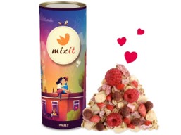 W Eliksirze miłości od Mixit znajdziesz chrupiące płatki owsiane, jęczmienne oraz kukurydziane w białej czekoladzie. Dodatkowo mieszanka pełna jest liofilizowanych owoców, takich jak jagody w gorzkiej czekoladzie czy maliny. Uzupełnienie stanowią płatki migdałów, czekolada owocowa oraz mielone nasiona guarany.