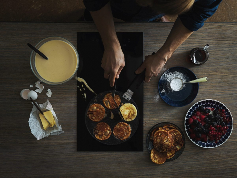 Macie nieco więcej czasu na leniwe, weekendowe śniadanie? Zróbcie z nami smakowite amerykańskie placuszki. Pancakes, bo o nich mowa, świetnie smakuje na gorąco. Do ich przygotowania przydadzą się podstawowe składniki, a do usmażenia - aluminiowa patelnia Fiskars z serii Hard Face. Wyróżnia ją bardzo wytrzymała powłoka Hardtec Superior+™, która zapobiega przywieraniu. Patelnia ma specjalny kształt - dostosowany do takiego śniadania na gorąco i nie tylko! To najprostszy sposób, aby przygotować doskonałe placki w idealnym kształcie. Nowoczesny, czarny design uzupełniony jest bakelitową rączką, która nie nagrzewa się i gwarantuje pewny chwyt. Dzięki temu pancakes to dziecinnie prosty przepis!