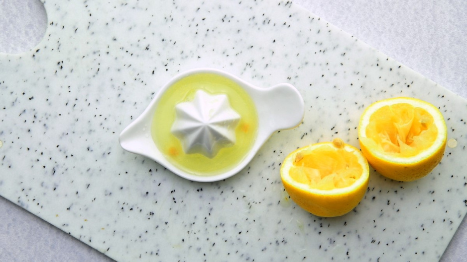 Cytrynę myjemy, przecinamy na pół i wyciskamy z niej sok. Jeśli chcemy wytłoczyć więcej płynu, warto owoc rolować wcześniej na desce lub blacie kuchennym, dociskając go delikatnie do podłoża.