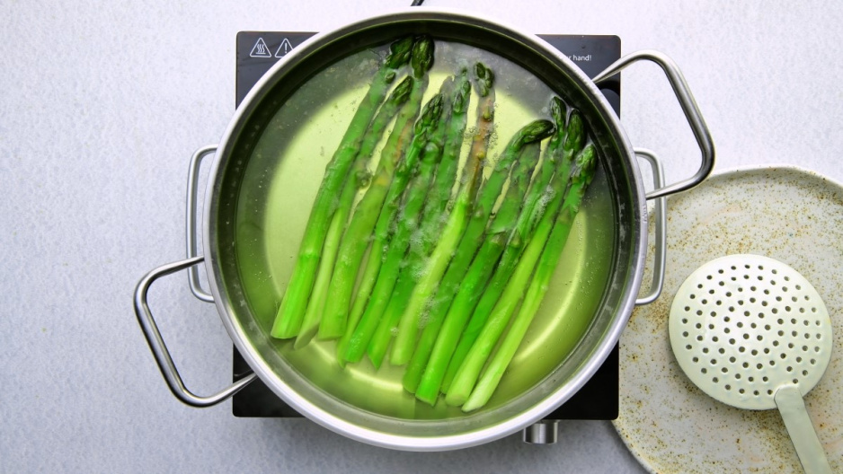 Zielone szparagi dokładnie myjemy w zimnej wodzie i osuszamy ręcznikiem papierowym (nie musimy ich obierać). Następnie odrywamy zdrewniałą część łodygi – wystarczy ją delikatnie wygiąć, a łykowata część sama przełamie się w odpowiednim miejscu. Do garnka wlewamy wodę, dodajemy szczyptę soli i ustawiamy na wyższej mocy palnika. Gdy zacznie bulgotać, na wrzątek wrzucamy szparagi i gotujemy przez 3-4 minuty. Kiedy nieco zmiękną, odcedzamy je i odkładamy na czysty talerz.