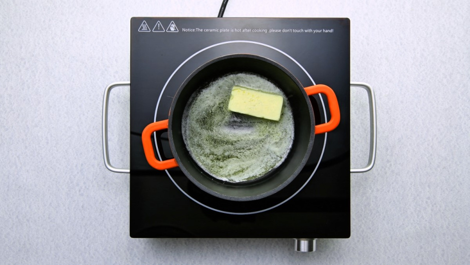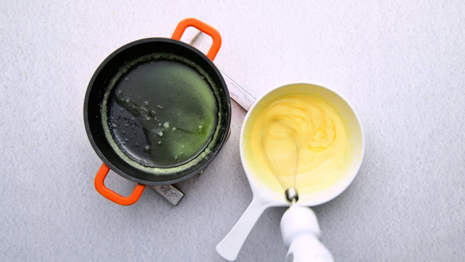 Do niewielkiego rondelka wrzucamy 50 g masła i ustawiamy na niskiej mocy palnika. Gdy tłuszcz się roztopi, zdejmujemy naczynie z płyty grzewczej.