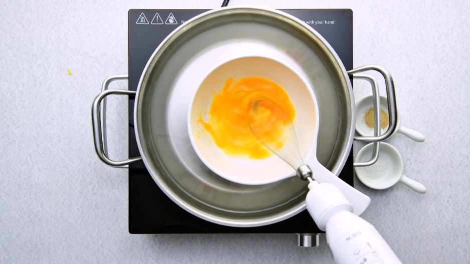 Do małego garnuszka wlewamy odrobinę wody (ok. ⅓ objętości) i ustawiamy na wyższej mocy palnika. Gdy zacznie bulgotać, zmniejszamy grzanie do minimum i wstawiamy naczynie z żółtkami oraz sokiem z cytryny (miska powinna być na tyle duża, by nie dotykała dna garnka – w przeciwnym razie płyn może się ściąć). Dodajemy sól i pieprz do smaku i ubijamy, aż powstanie jasna i puszysta masa.