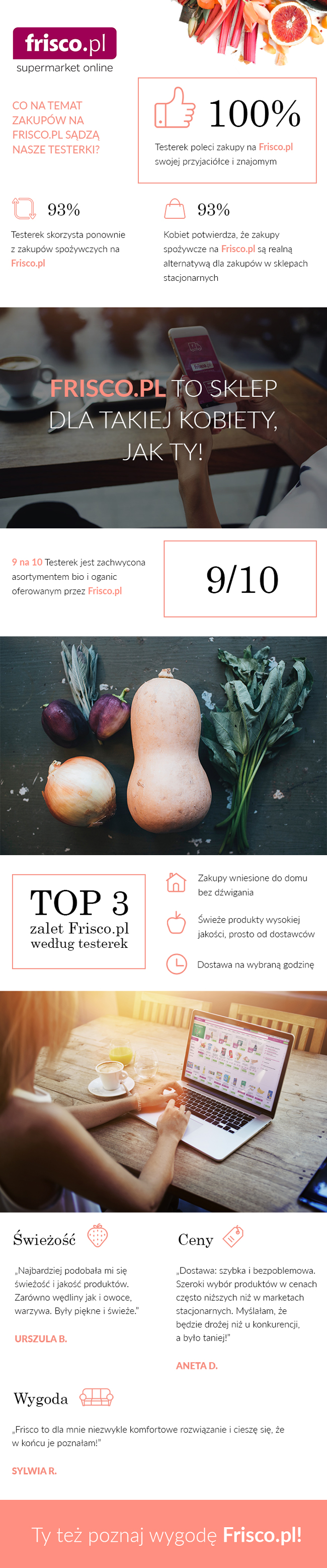 „Frisco to dla mnie niezwykle komfortowe rozwiązanie i cieszę się, że w końcu je poznałam! Zalet jest całe mnóstwo: komfort robienia zakupów z własnego domu, o każdej porze, z możliwością dostawy do samej kuchni... to nie marzenia, to rzeczywistość!” – Sylwia R.