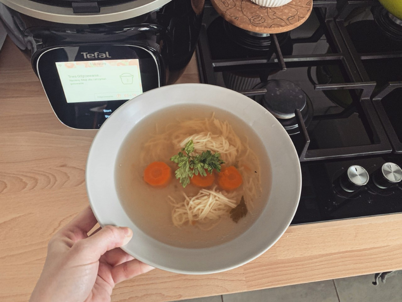 Miałam już w aplikacji długą listę dań, które chciałabym przygotować. Pierwszy był klasyk: rosół. To trudny test, bo dobry rosół wymaga odpowiedniego przygotowania. Tefal Cook4Me miał go przygotować w UWAGA jedynie 35 minut. Poprzeczka została więc podniesiona bardzo wysoko i szczerze... mocno obawiałam się, czy rosół wyjdzie.