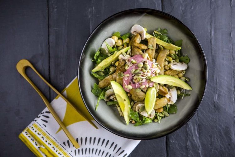 Do miski wrzuć rukolę i ugotowaną ciecierzycę. Pokrój grzyby i dodaj je do mieszanki. Smaż kurczaka wegańskiego Heura na patelni na złoty kolor. Połóż kurczaka wegańskiego Heura® na wierzchu i dodaj pokrojone awokado. Skrop oliwą, sokiem z cytryny i posyp solą. Następnie polej dużą łyżką domowego sosu. Posyp kiełkami i pestkami dyni.
