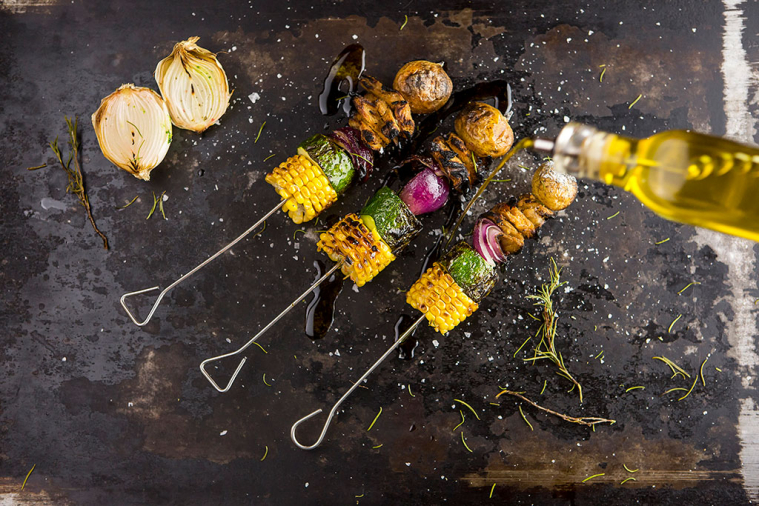 Rozgrzej piekarnik do 180ºC lub rozpal grill. Obierz ziemniaki, zrób w nich dziurki i ułóż na blasze lub ruszcie. Piecz przez 10 minut. W międzyczasie pokrój cukinię i kukurydzę w grube plastry. Cebulę obierz i pokrój na ćwiartki. Na patyczki do szaszłyków nabijaj na przemian warzywa i Kurczaka wegańskiego Heura. Dopraw solą i rozmarynem.