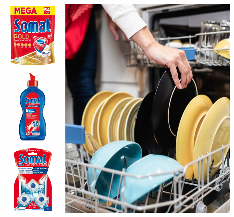Nie od dziś wiadomo, że zmywarka to najlepszy przyjaciel każdej pani domu, jednak aby mieć pewność, że poradzi sobie ona ze wszystkimi resztkami jedzenia i uporczywym tłuszczem, powinniśmy postawić na sprawdzone środki czystości. Nowa formuła Somat Gold o jeszcze lepszej rozpuszczalności gwarantuje szybkie i bardziej efektywne działanie, nawet w krótkich cyklach i niskich temperaturach mycia. Tabletki działają kompleksowo – usuwają najcięższe zabrudzenia, zapewniają naczyniom perfekcyjną czystość, bez naruszenia struktury tworzywa, z którego powstały. Z kolei nabłyszczacz Somat sprawia, że woda równomiernie spływa z naczyń, nie pozostawiając zacieków. Daje to efekt szybkiego schnięcia, który sprawia, że naczynia są lśniące.