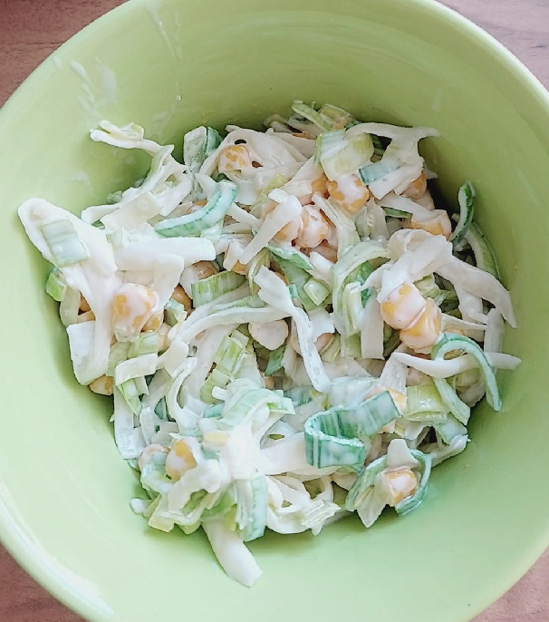 Por kroimy na cienkie ćwiartki, sparzamy wrzątkiem, przy okazji wypłukując ziemię i hartujemy zimną wodą. Ser ścieramy na grubych oczkach. Łączymy por, ser i kukurydzę, dodajemy majonez, przyprawiamy solą, pieprzem i gotowe!