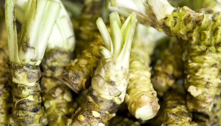 Te niepozorne korzonki to wasabi, czyli japoński chrzan, kojarzony głównie jako dodatek do sushi. Czym się różni wasabi od chrzanu, jaki znamy z naszych podwórek? Oczywiście przede wszystkim charakterystycznym zielonym kolorem, ale też znacznie wyraźniejszym smakiem, gdyż ten japoński korzeń ma wyczuwalną ziołową nutę.