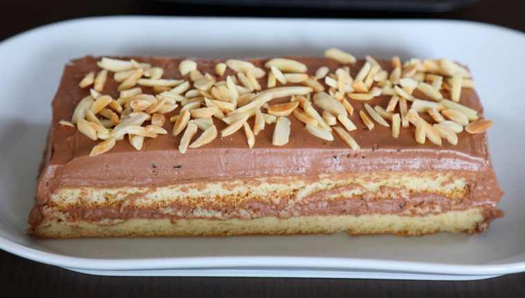 Wystudzony biszkopt dzielimy na 2 blaty i przekładamy połową kremu budyniowego. Na wierzchu wykładamy resztę czekoladowej masy i posypujemy całość prażonymi migdałami. Tak przygotowane ciasto z budyniową masą czekoladową wstawiamy do lodówki na co najmniej 2-3 godziny, a najlepiej nawet na całą noc.