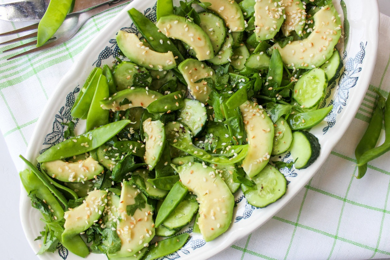 Aby przygotować tę prostą i błyskawiczną surówkę wystarczy tylko ogórek i awokado. Ten zielony duet to prawdziwa skarbnica cennych dla organizmu składników, jednak niestety żaden z produktów nie ma zbyt wiele naturalnego wyrazu. Niezbędnym elementem zielonej surówki jest więc charakterny sos na bazie oleju sezamowego, sosu sojowego, octu ryżowego oraz czosnku i imbiru. Do tego jeszcze tylko posiekana kolendra oraz uprażone nasiona sezamu i pyszna kombinacja w 15 minut gotowa.